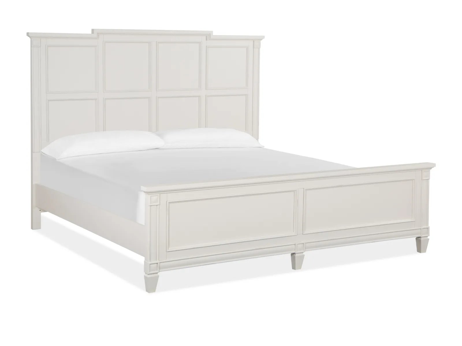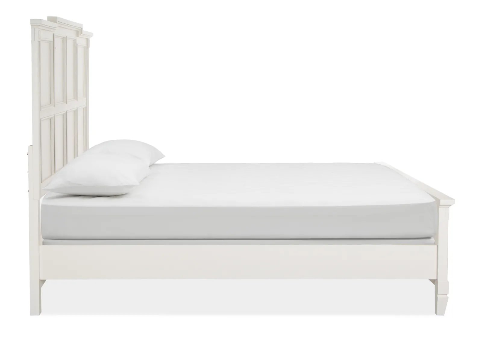 Charming and chic, Watley combines a soft and casual Egg Shell White finish with classic forms to create a soothing atmosphere that relaxes mind and body. Create a serene setting with vintage silhouettes featuring breakfront shaping on the dresser, panel bed headboard and mirror, and tarnished silver hardware including a decorated knob and elegant bail pull. Crafted of Birch Veneer and Hardwood Solids with a subtle gray wash over the creamy finish, Watley is at home in settings from cottage to coastal and from traditional to soft modern. The stunning panel bed has a storage footboard option with two drawers and a wood-framed upholstered headboard. Three nightstand options are offered including a two-drawer nightstand, one-drawer nightstand with two shelves, and a door bachelor’s chest. The functional door chest has a sliding wood door with wood shelves behind, five left drawers with felt-lined top drawers and one bottom drawer. From beaches to the countryside, and from mountain valleys to suburban trails, Watley is a relaxing destination for the end of each day’s journey.