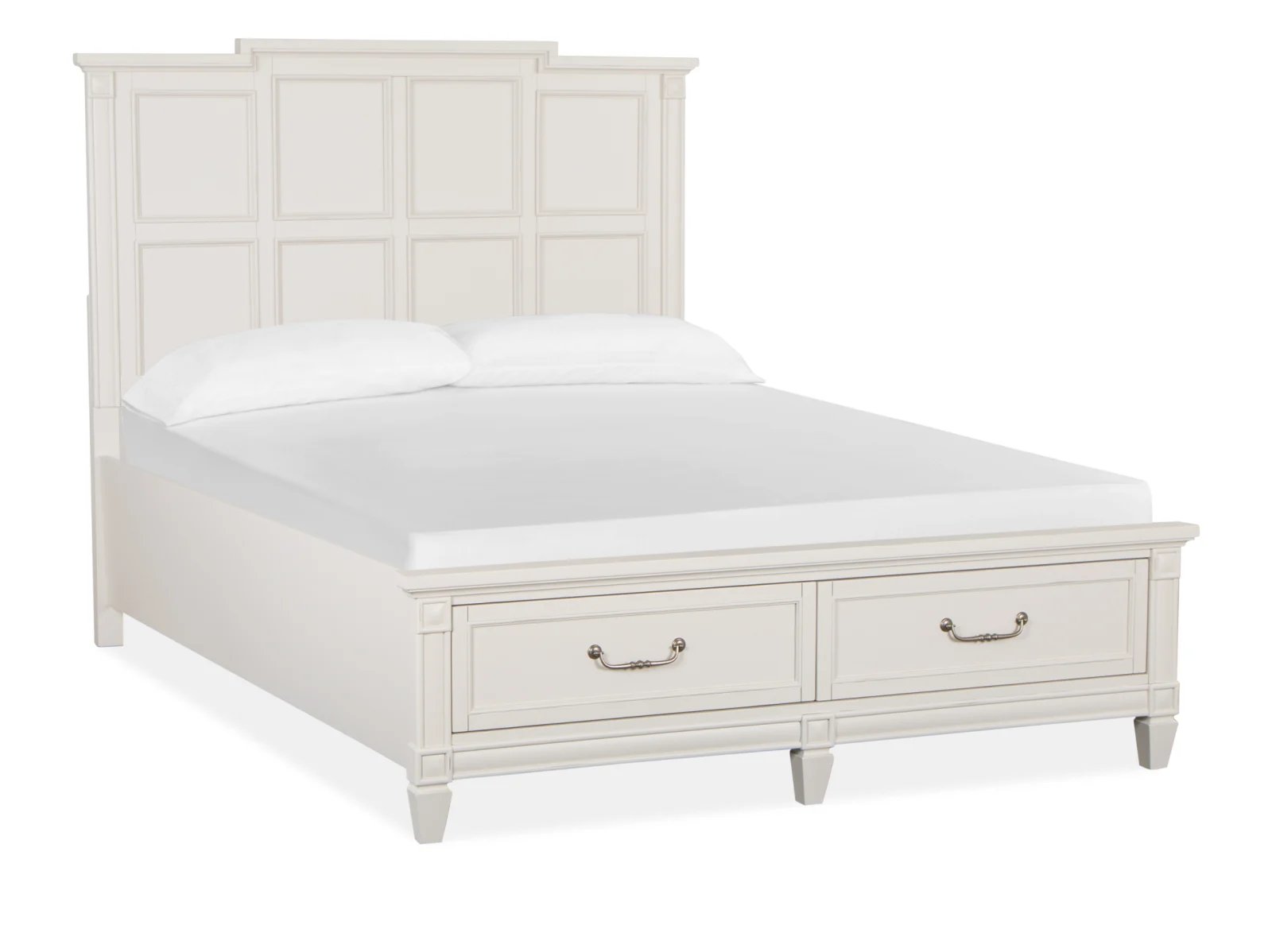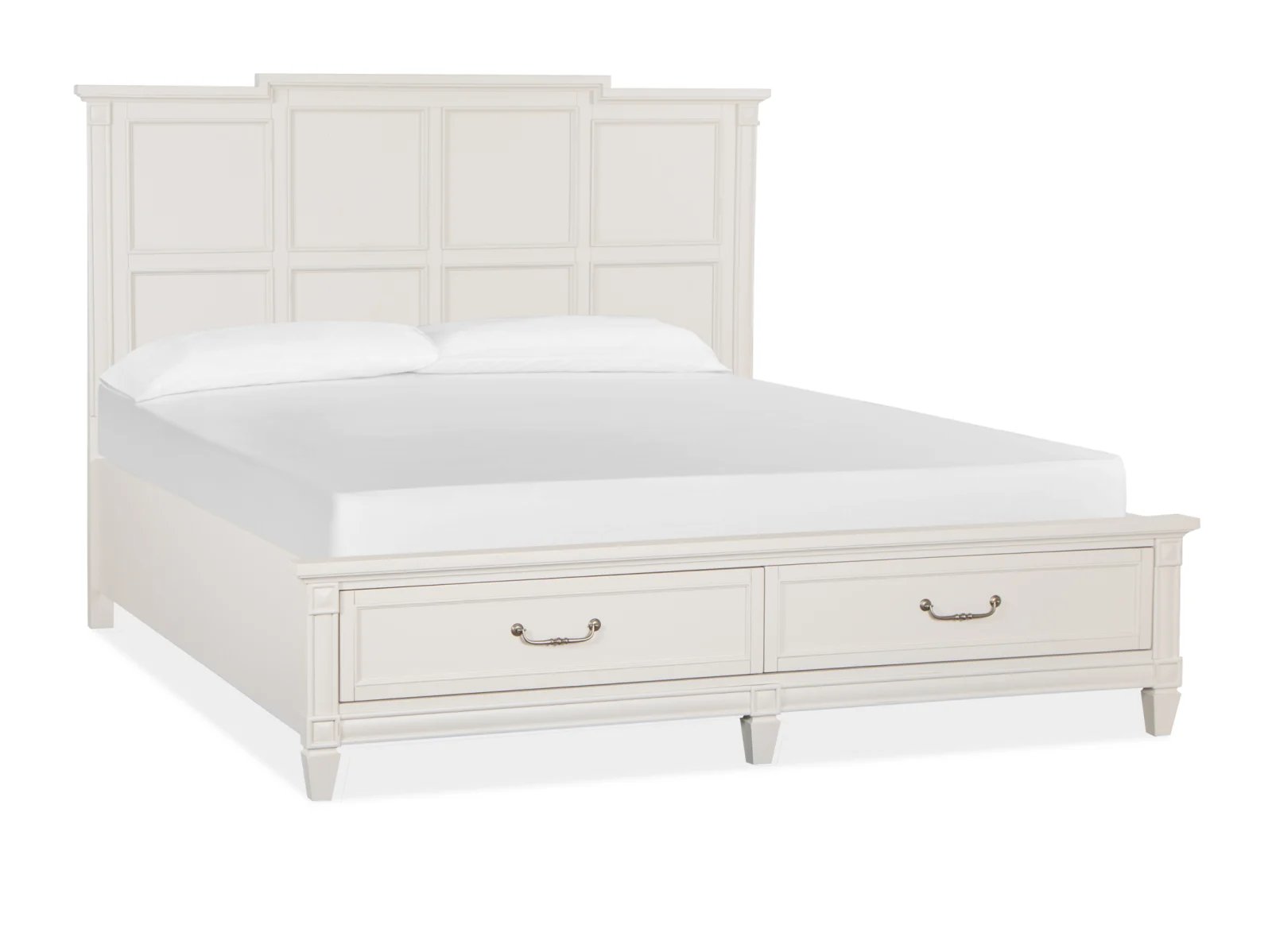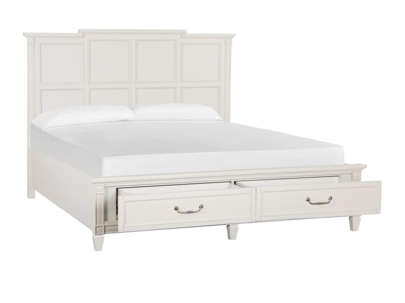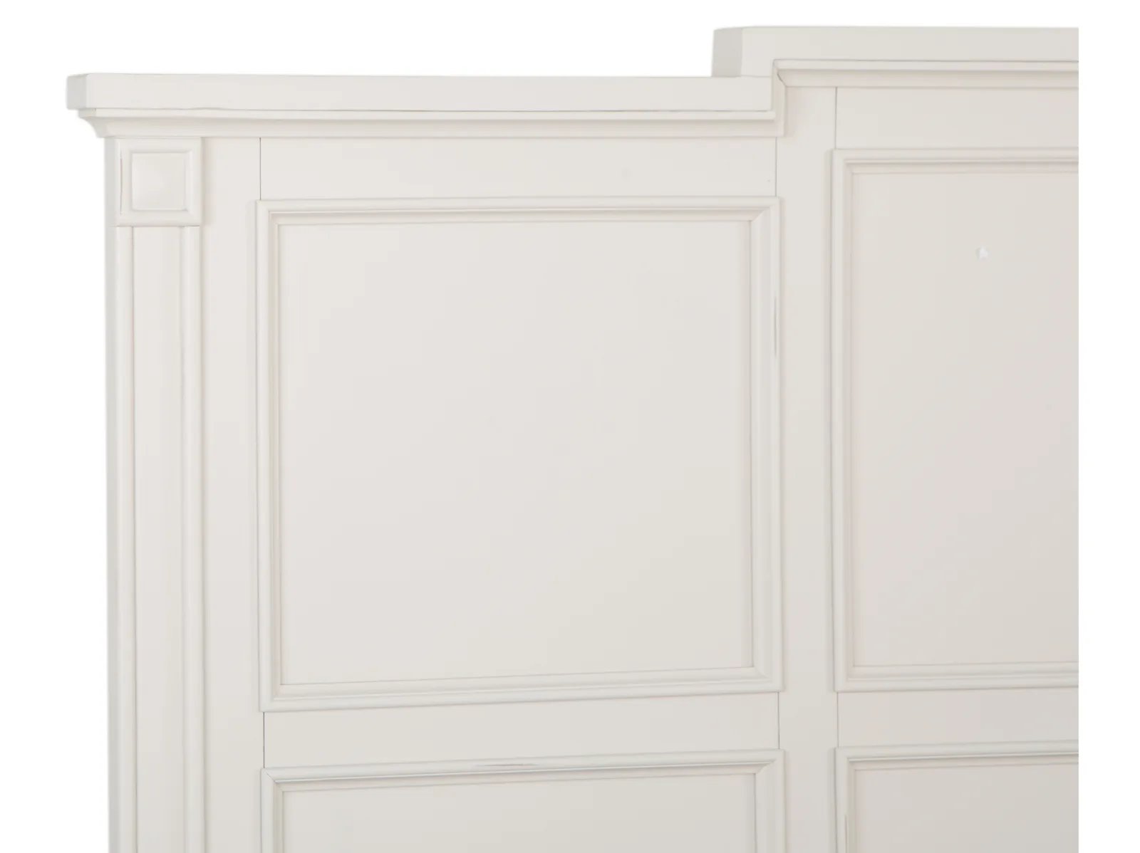 Charming and chic, Watley combines a soft and casual Egg Shell White finish with classic forms to create a soothing atmosphere that relaxes mind and body. Create a serene setting with vintage silhouettes featuring breakfront shaping on the dresser, panel bed headboard and mirror, and tarnished silver hardware including a decorated knob and elegant bail pull. Crafted of Birch Veneer and Hardwood Solids with a subtle gray wash over the creamy finish, Watley is at home in settings from cottage to coastal and from traditional to soft modern. The stunning panel bed has a storage footboard option with two drawers and a wood-framed upholstered headboard. Three nightstand options are offered including a two-drawer nightstand, one-drawer nightstand with two shelves, and a door bachelor’s chest. The functional door chest has a sliding wood door with wood shelves behind, five left drawers with felt-lined top drawers and one bottom drawer. From beaches to the countryside, and from mountain valleys to suburban trails, Watley is a relaxing destination for the end of each day’s journey.
