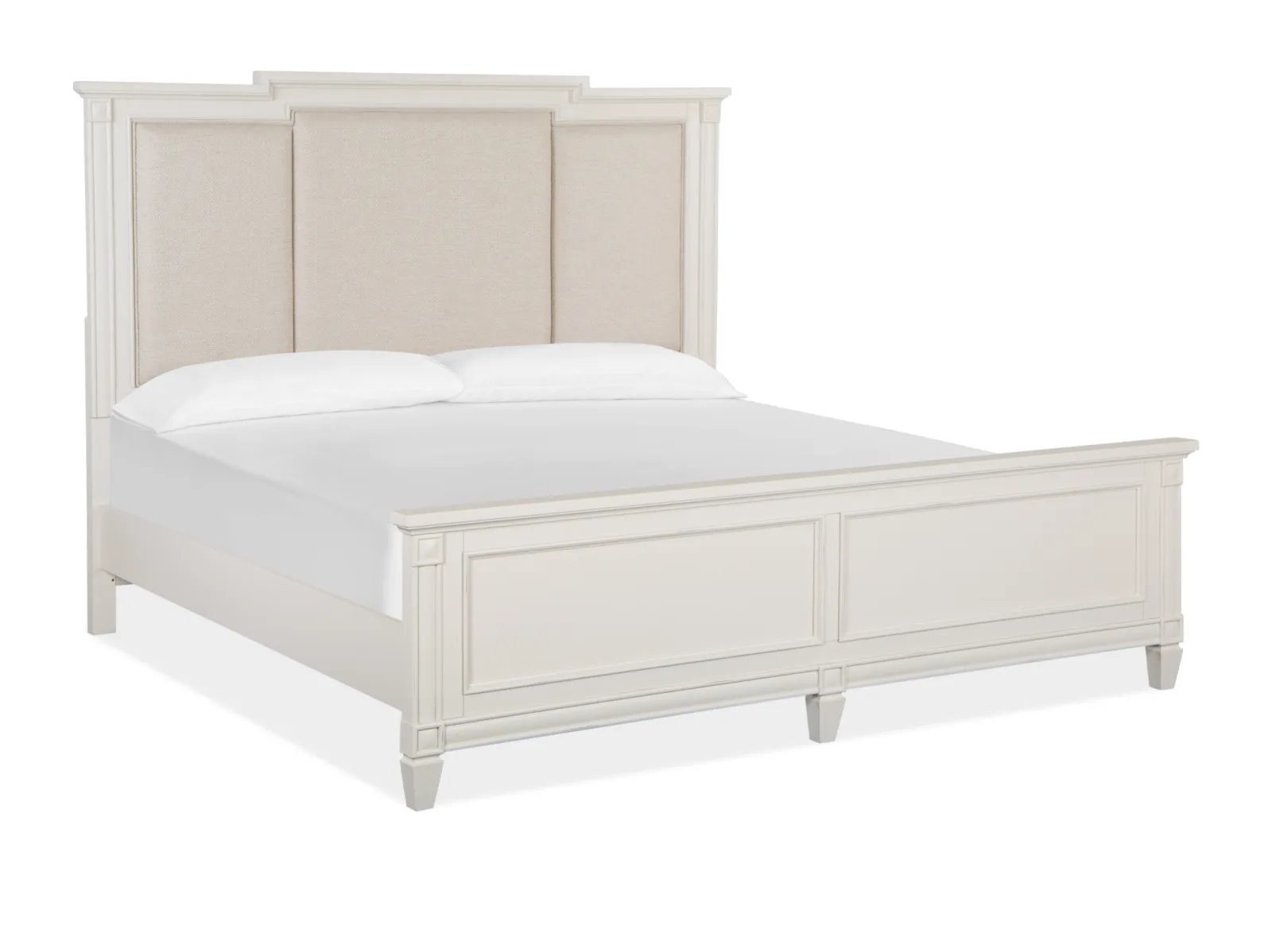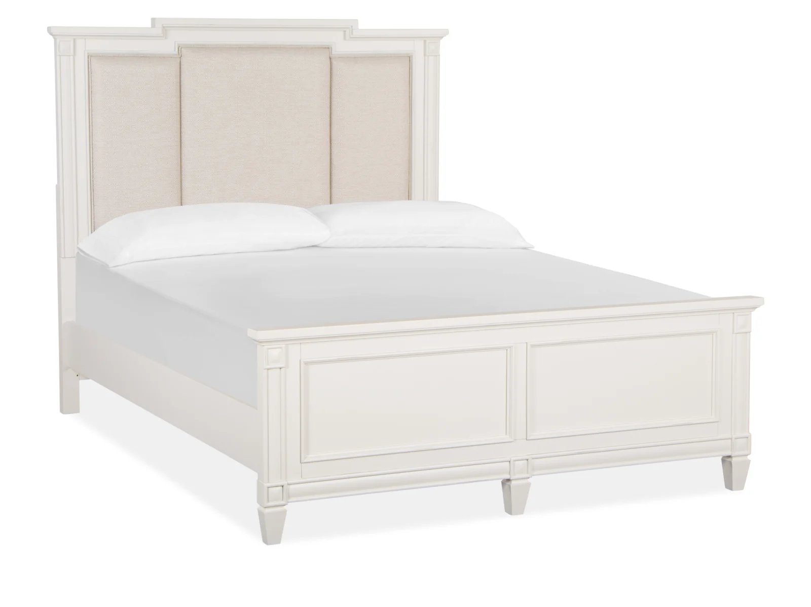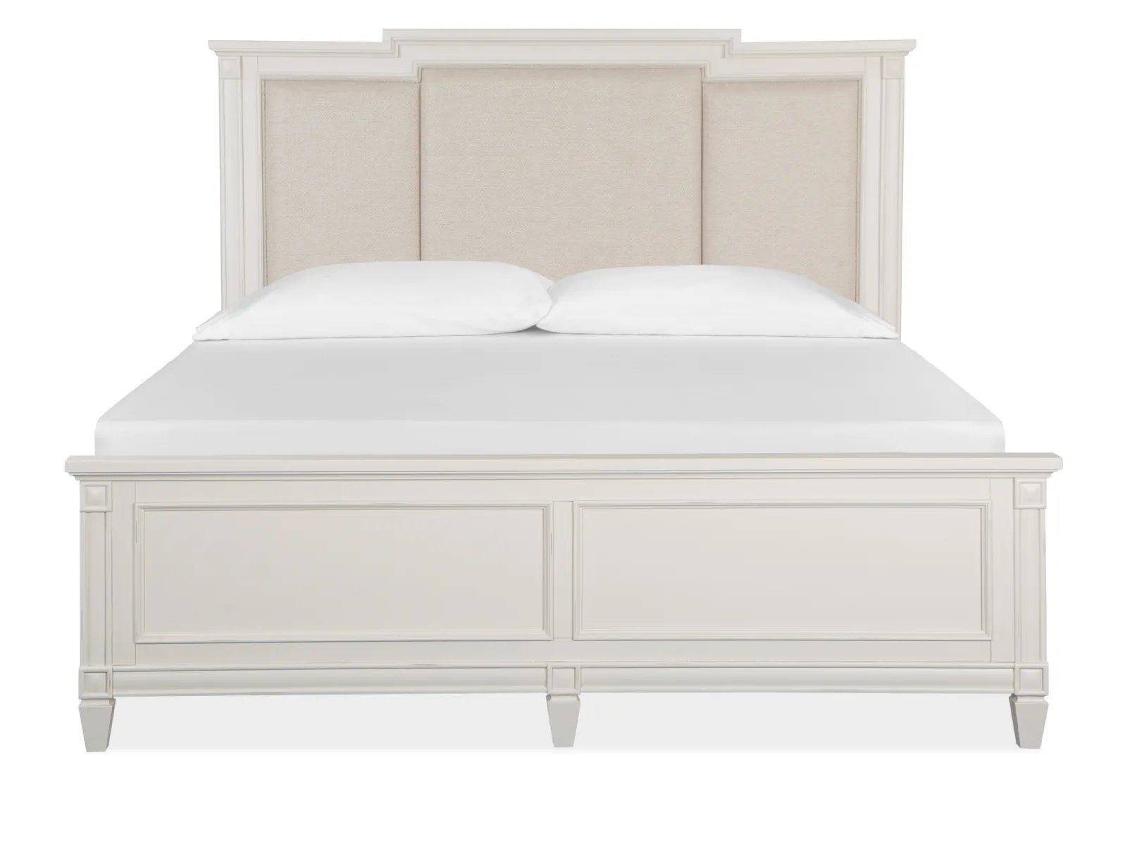 Charming and chic, Watley combines a soft and casual Egg Shell White finish with classic forms to create a soothing atmosphere that relaxes mind and body. Create a serene setting with vintage silhouettes featuring breakfront shaping on the dresser, panel bed headboard and mirror, and tarnished silver hardware including a decorated knob and elegant bail pull. Crafted of Birch Veneer and Hardwood Solids with a subtle gray wash over the creamy finish, Watley is at home in settings from cottage to coastal and from traditional to soft modern. The stunning panel bed has a storage footboard option with two drawers and a wood-framed upholstered headboard. Three nightstand options are offered including a two-drawer nightstand, one-drawer nightstand with two shelves, and a door bachelor’s chest. The functional door chest has a sliding wood door with wood shelves behind, five left drawers with felt-lined top drawers and one bottom drawer. From beaches to the countryside, and from mountain valleys to suburban trails, Watley is a relaxing destination for the end of each day’s journey.