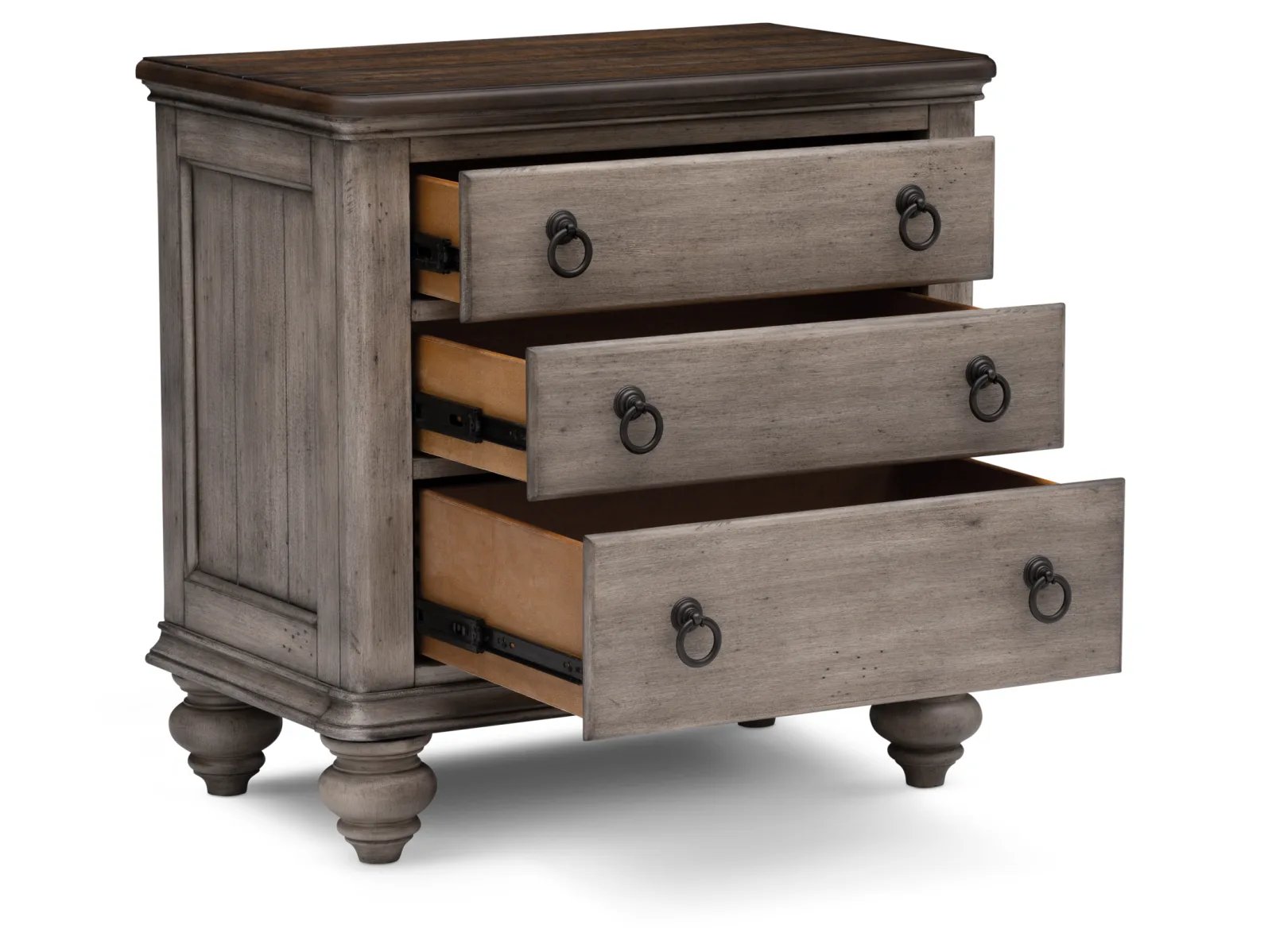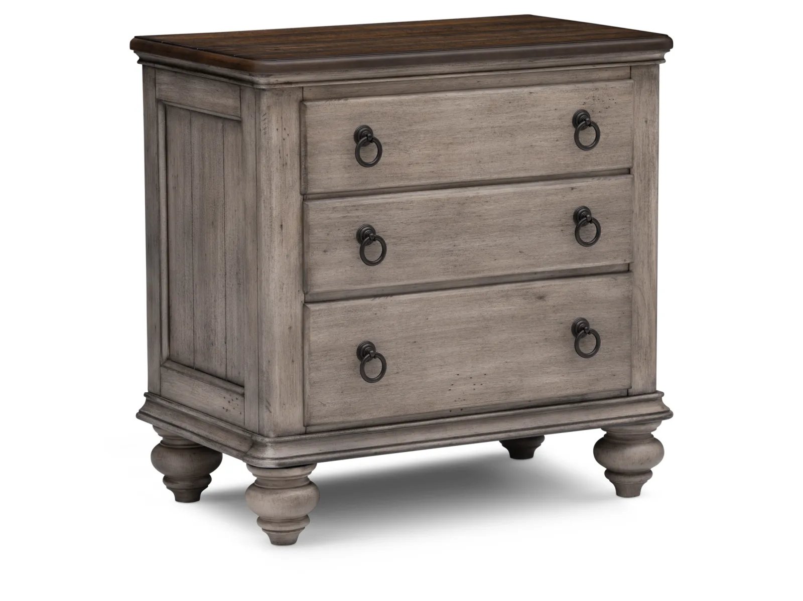 The two-toned finish and farmhouse design of the Webster Nightstand is just right for today’s transitional look. This beautiful furnishing features the perfect blend of country cottage charm and farmhouse feel. Crafted of acacia solids and veneers, the Webster is made to wear beautifully over the years with its distressed gray-white finish and natural acacia top. Dovetailed drawer fronts, turned feet, and gray washed metal ring pulls add an antique touch to this piece, while electric outlets make charging electronics easy. Take home this stunning nightstand today.