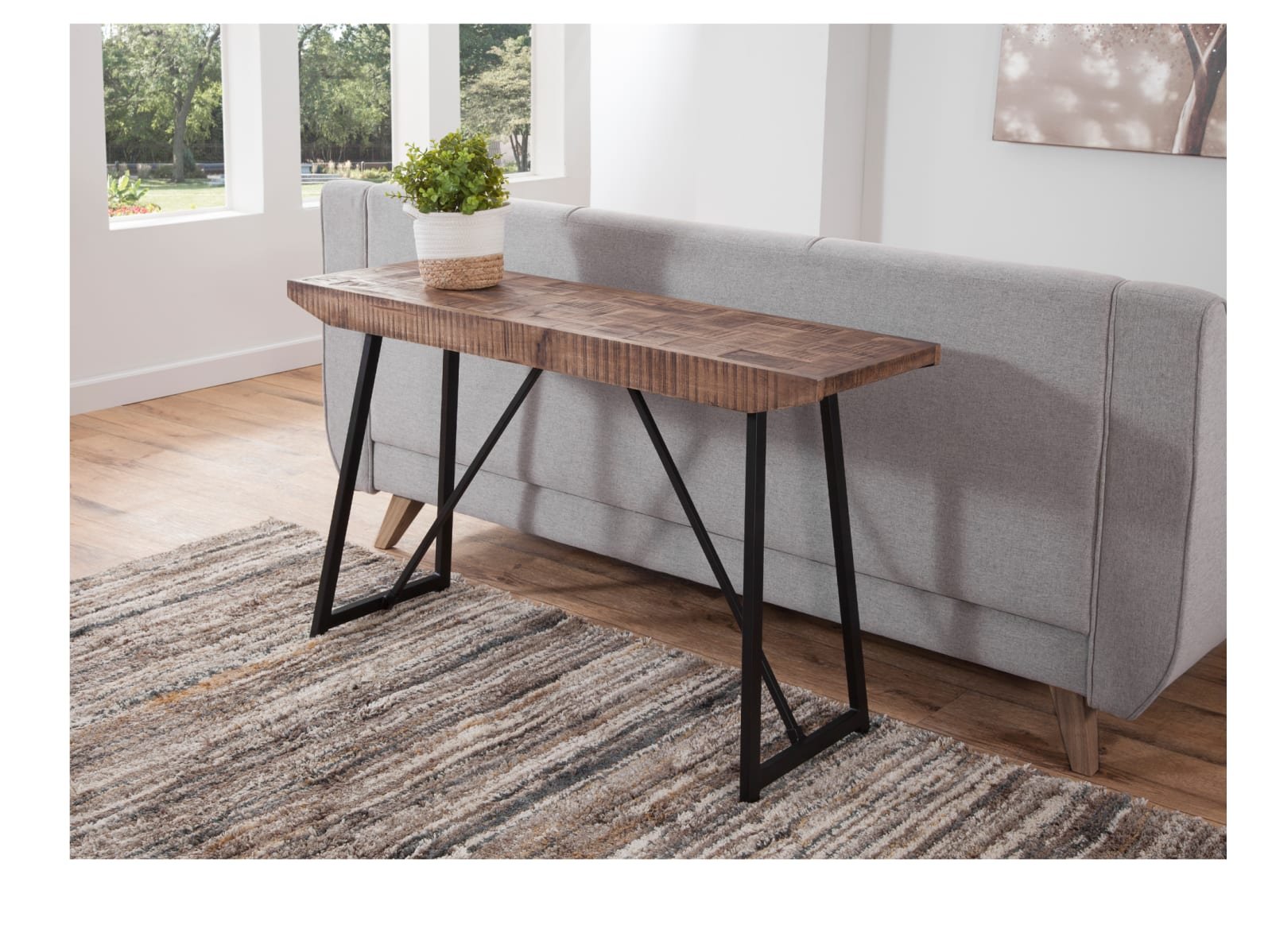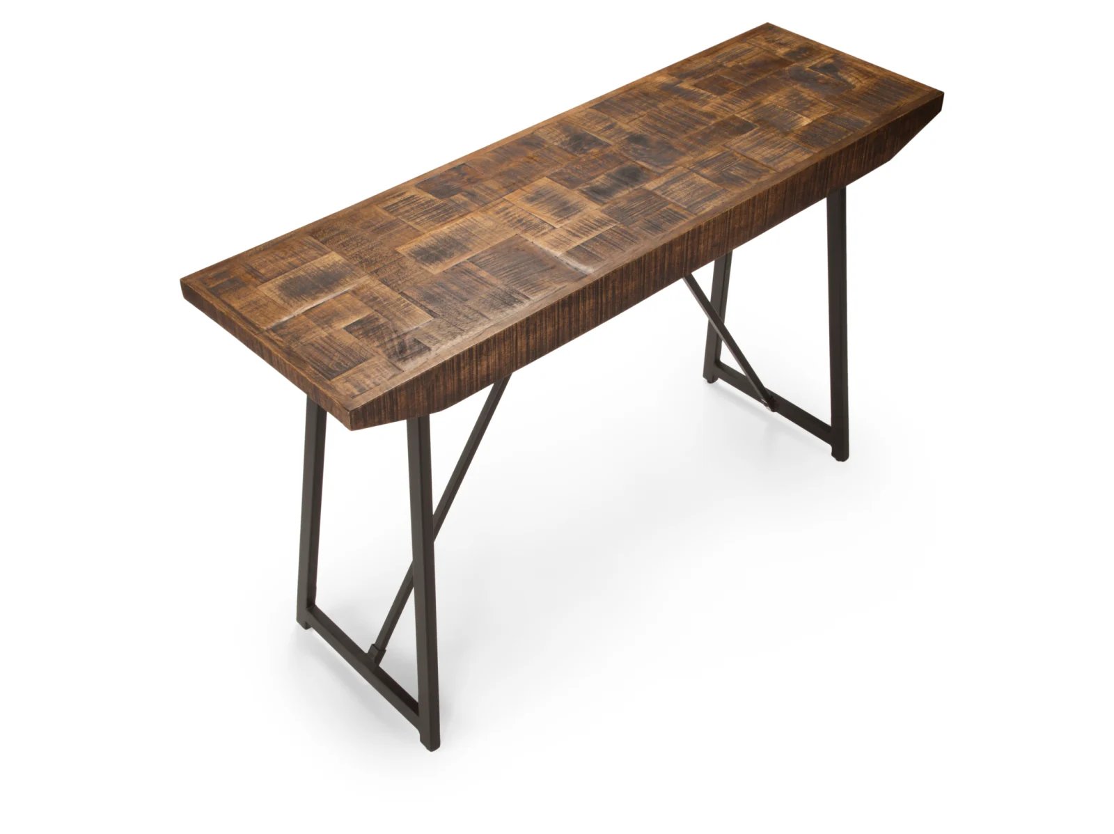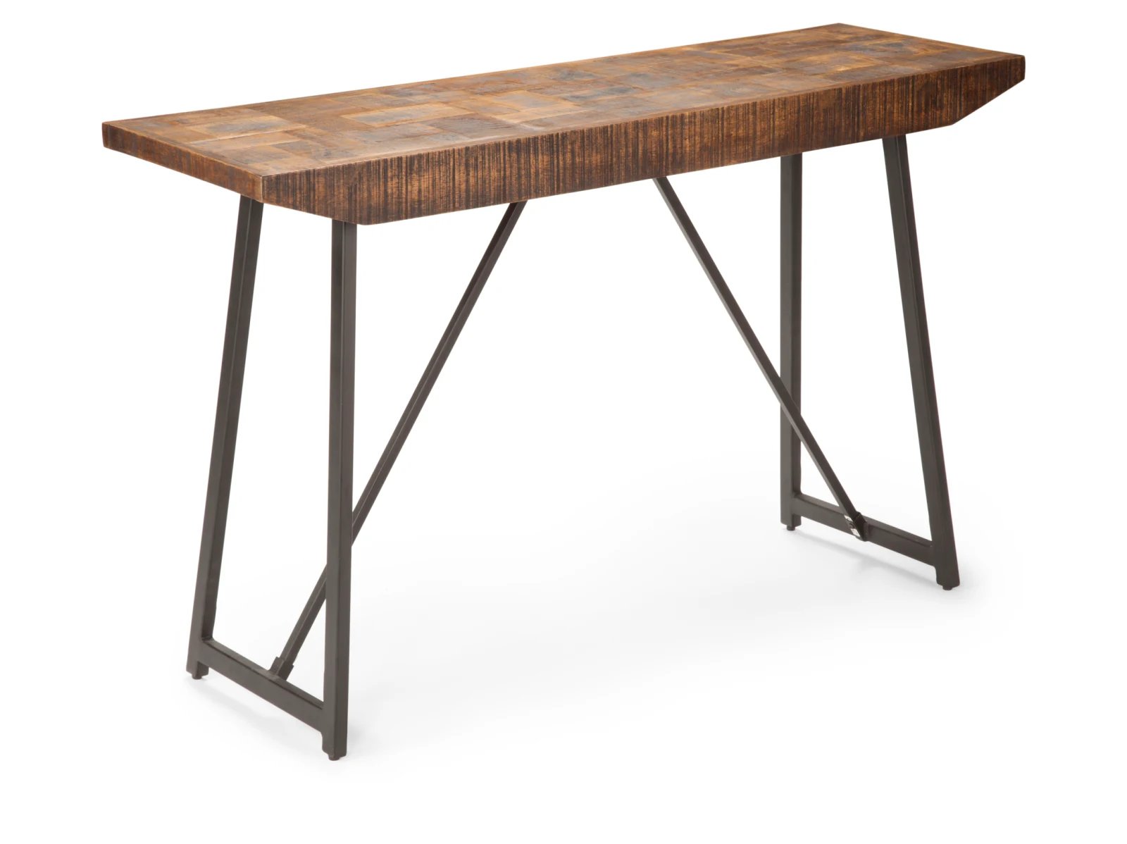 The Weniger Sofa Table combines rustic charm with industrial flair, making it a standout piece for your living space or entryway. Crafted from rich mango wood, the Weniger’s rectangular table top showcases a striking parquet pattern, and it features a robust iron base to provide bold contrast, creating a perfect blend of warmth and style. With its unique design and expert craftsmanship, the Weniger Sofa Table effortlessly elevates your living room’s aesthetic while offering functional surface space for decor or everyday items.