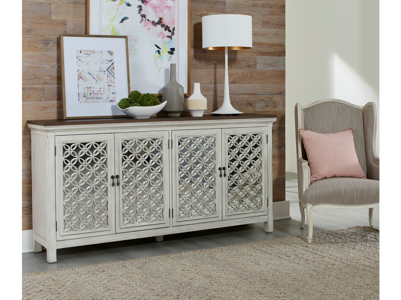 Transform your home with the Westin 4 door accent cabinet. Crafted of Eucalyptus solids and Ash veneers in an antique white or grey finish. Features four mirrored doors with decorative floral pattern overlays, block feet and one concealed fixed shelf behind doors. A unique piece that will work with any décor from traditional to contemporary.
