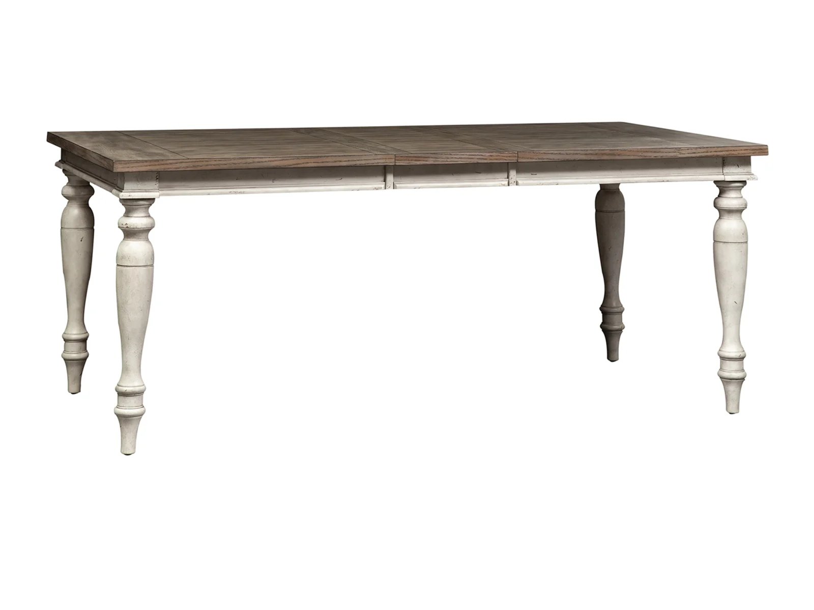 Gather around the Whittier rectangular leg table. Crafted of rubberwood solids and oak veneers, this piece features an English country charm, one 12″ leaf to accommodate guests or a larger family, planked top, and is anchored by heavily turned legs. The antique linen and weathered gray finish gives this group an heirloom appeal.