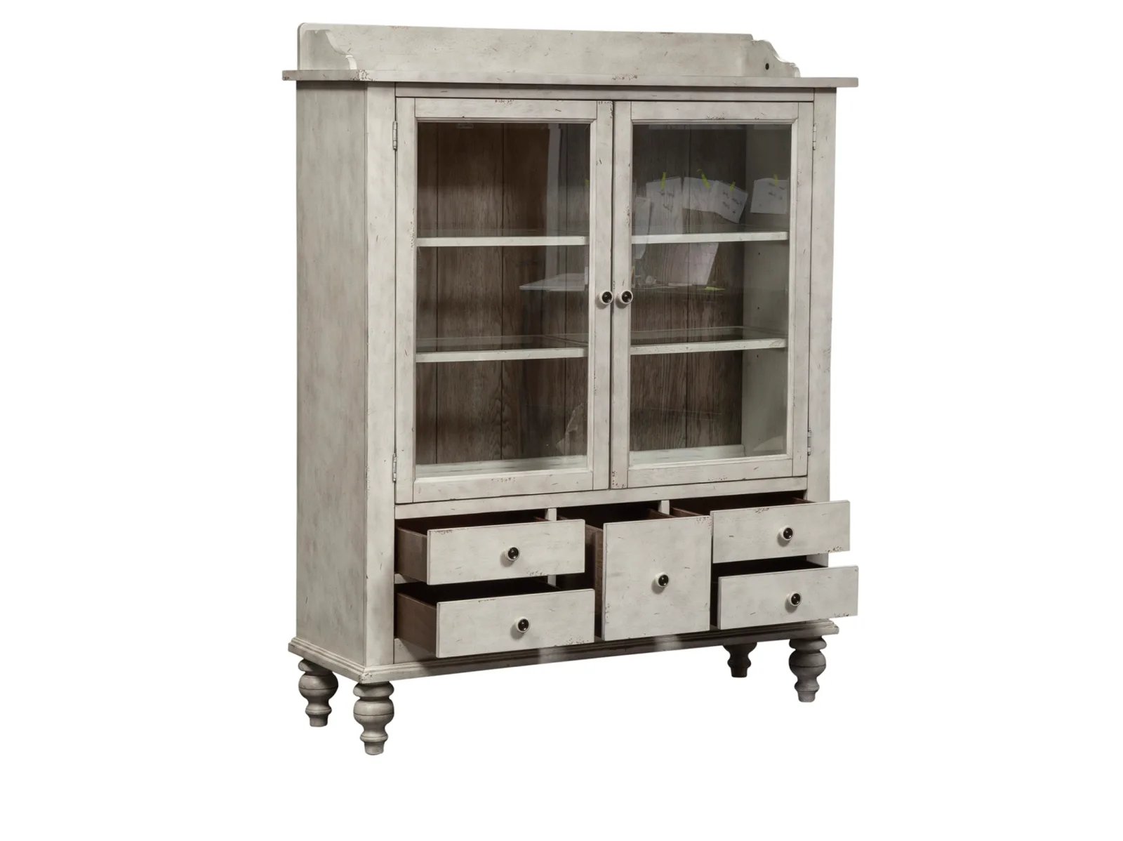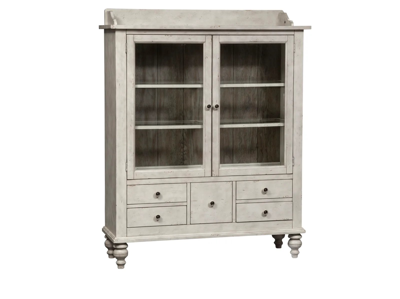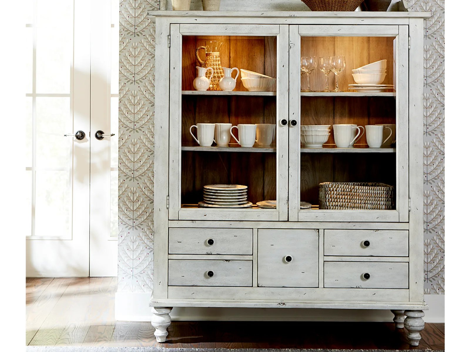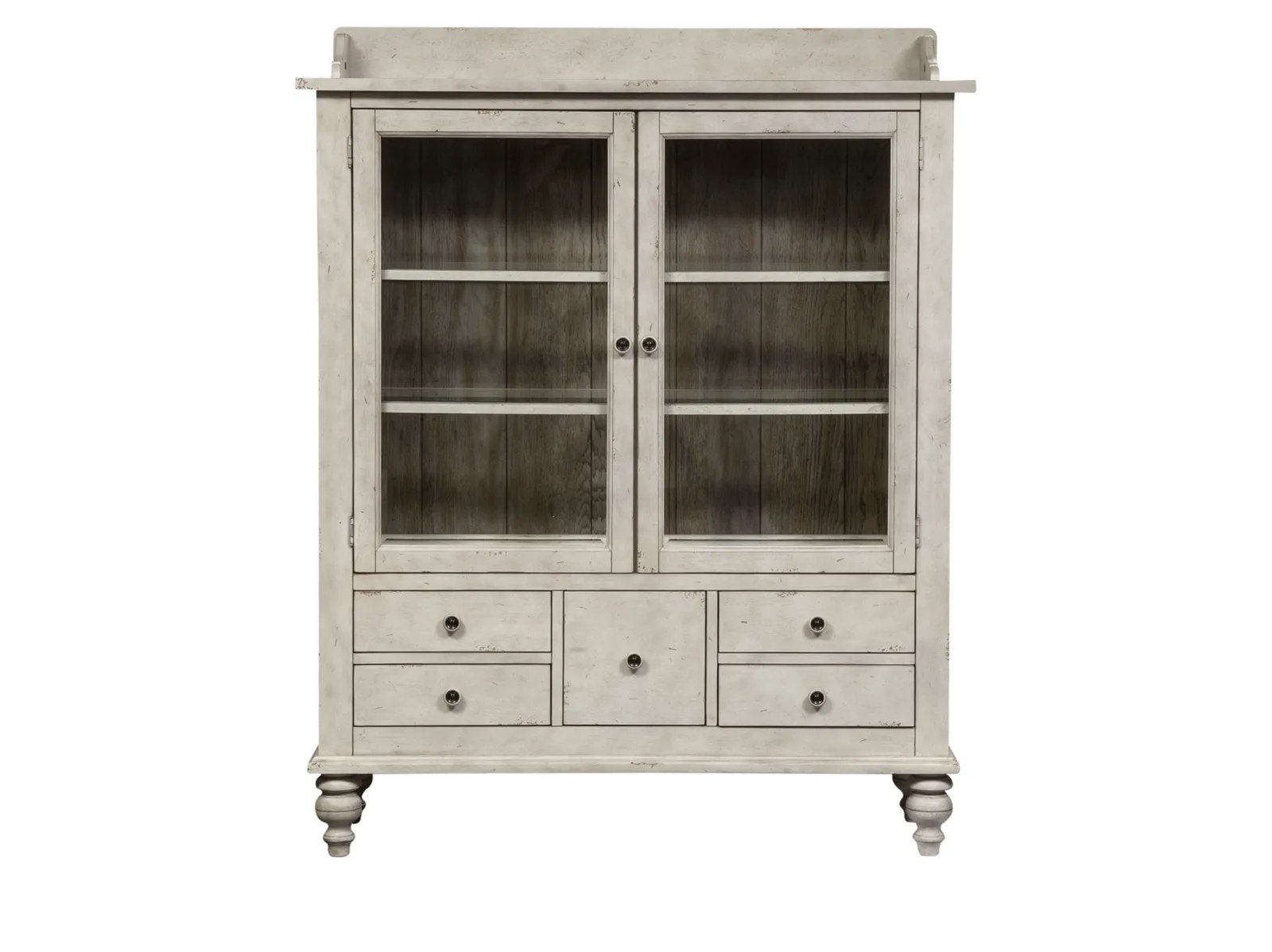 Invite an English country charm into your home with the Whittier display cabinet. Crafted of rubberwood solids with oak veneers, this piece features wooden drawer glides, felt lined top and center drawers to protect contents, a gallery top, planked back panel in a weathered grey finish, two wood framed glass shelves behind the two wood framed glass doors, touch lighting to illuminate the display, five bottom storage drawers, turned bun feet, and is accented by wooden knob hardware with metal inserts. The antique linen and weathered gray finish gives this group an heirloom appeal.