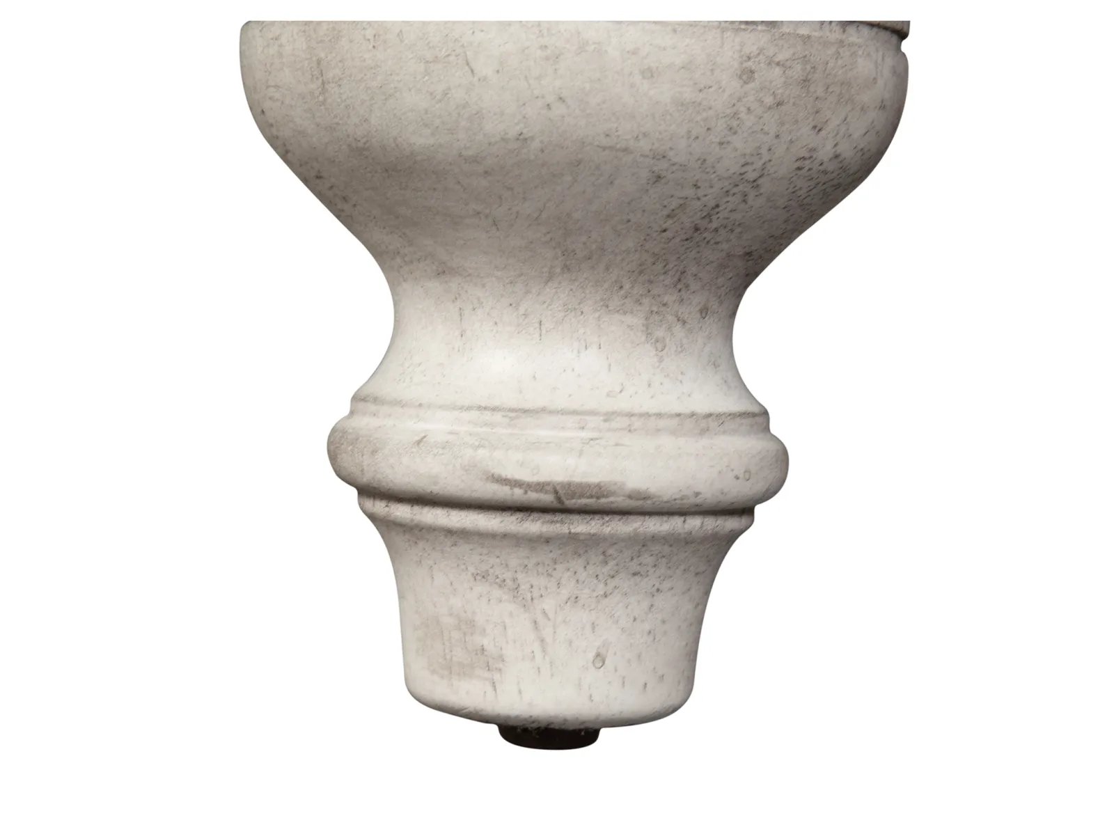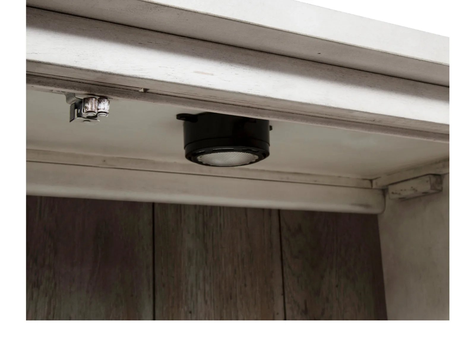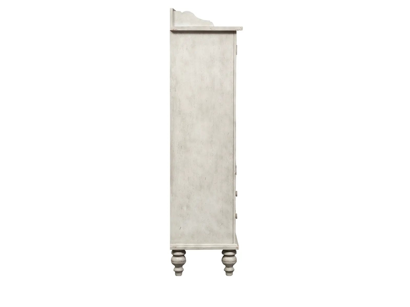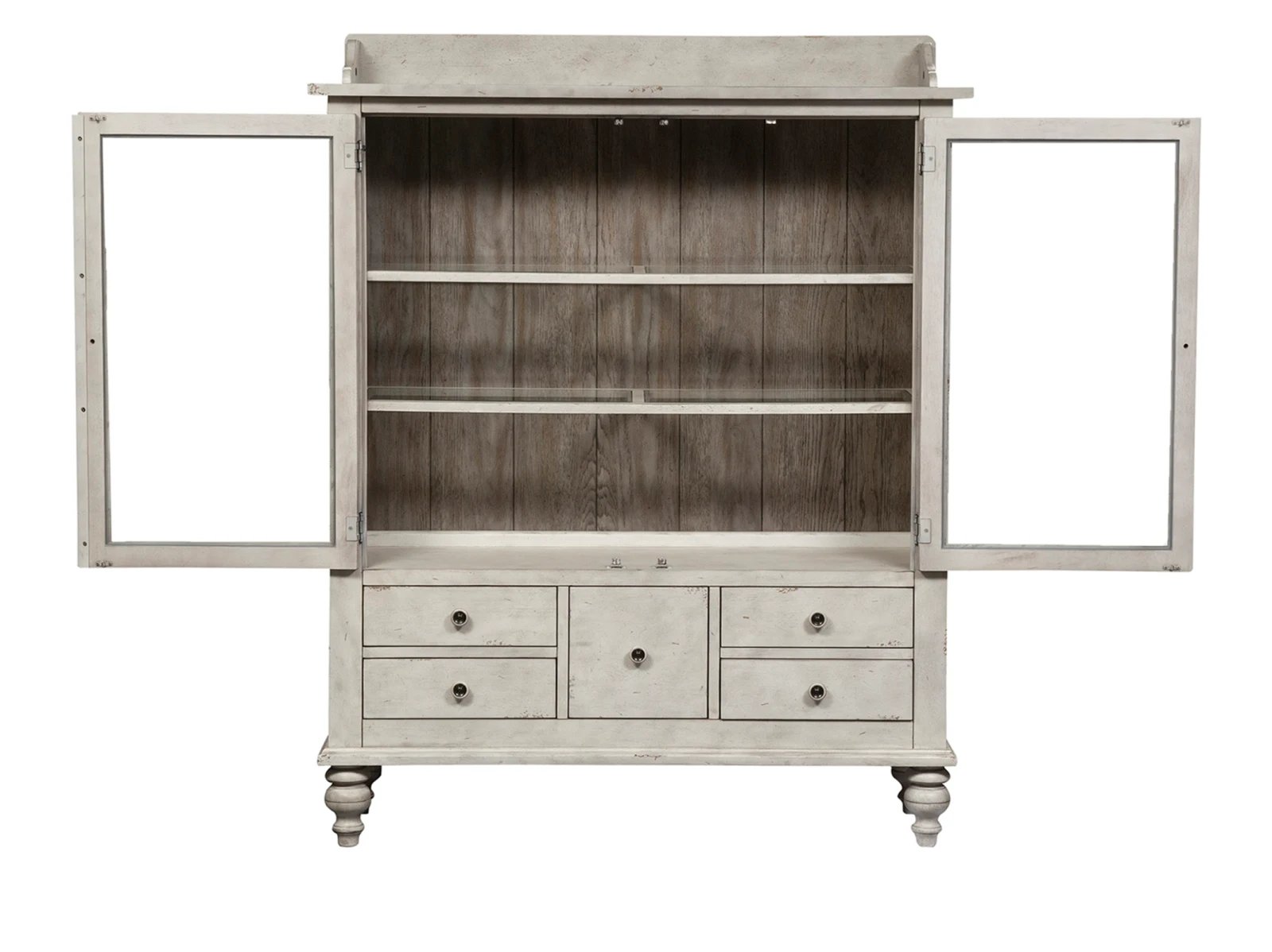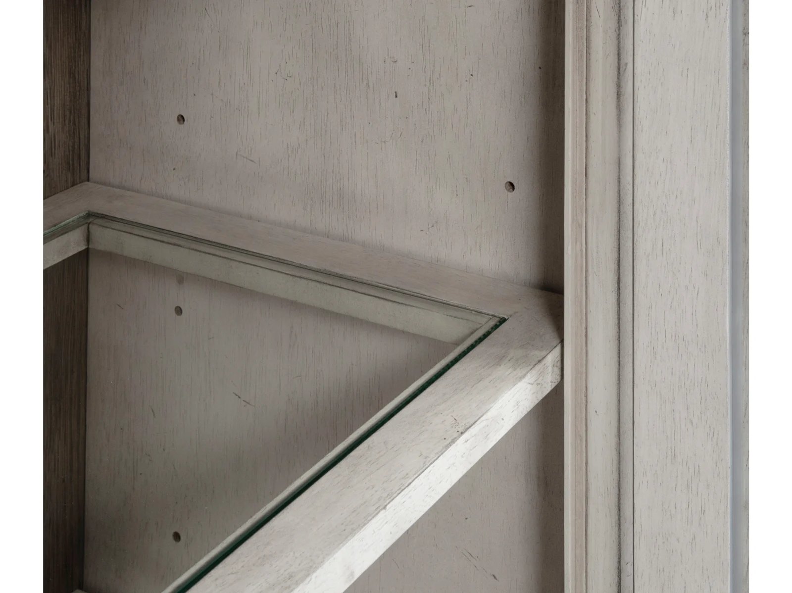 Invite an English country charm into your home with the Whittier display cabinet. Crafted of rubberwood solids with oak veneers, this piece features wooden drawer glides, felt lined top and center drawers to protect contents, a gallery top, planked back panel in a weathered grey finish, two wood framed glass shelves behind the two wood framed glass doors, touch lighting to illuminate the display, five bottom storage drawers, turned bun feet, and is accented by wooden knob hardware with metal inserts. The antique linen and weathered gray finish gives this group an heirloom appeal.