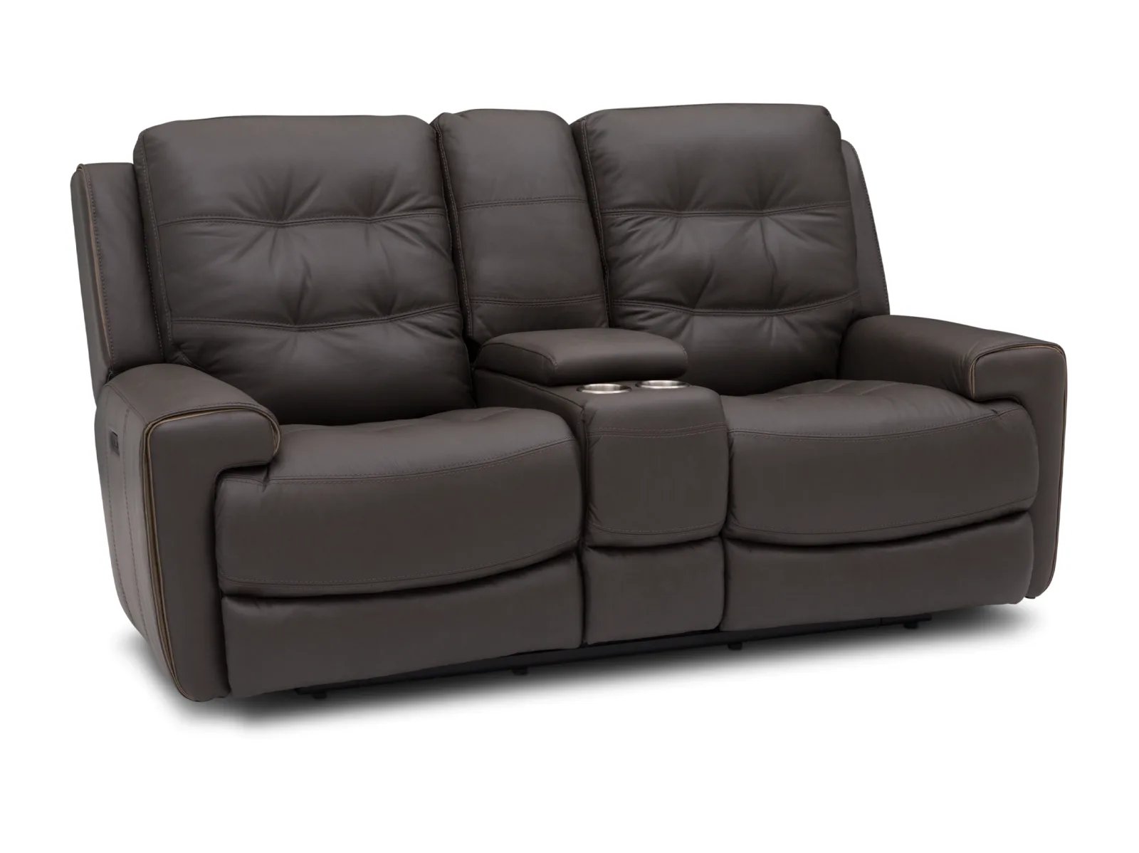 The Wicklow Power Reclining Console Loveseat is a combination of unexpected style, comfort, and quality. The contrast leather application on the stylish track arms and the soft tufted backs offers a unique appearance. The vacuum-finished taupe and beige leather upholstery gives you a feel like no other. You will even be surprised by the power headrests, which offer unrivaled comfort for your head and neck, and the convenient storage console and cup-holders. Add this powerful reclining loveseat today.