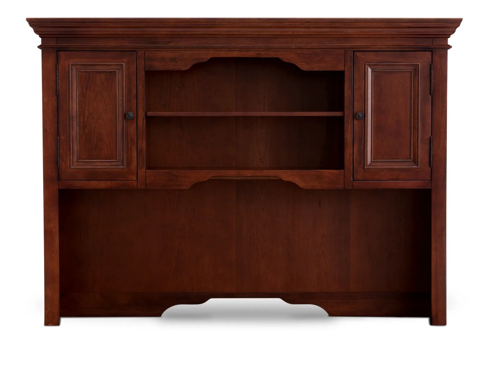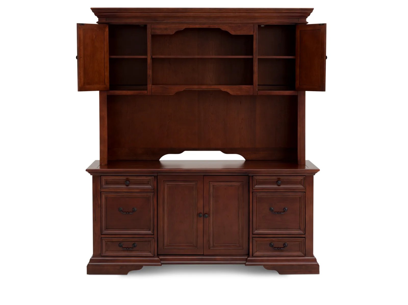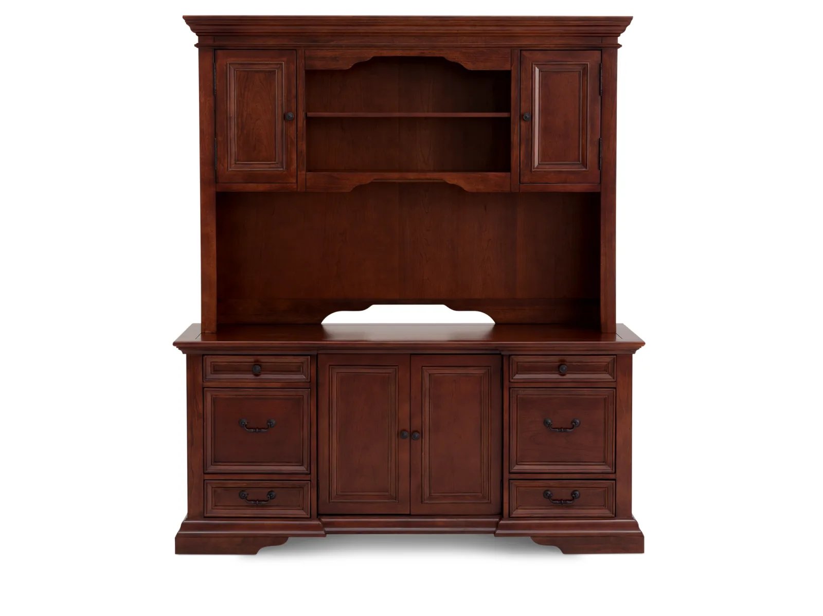 & Free ShippingThe Wilshire Hutch offers traditional and professional styling for your home office. This classic design is constructed with real cherry veneers and solids finished in rich cherry and includes ample shelf and cabinet space for all your office essentials you can’t fit in the bottom drawers. Along with the beautiful cherry wood and heavy crown moldings, this hutch will lend itself beautifully in the home or the most upscale office. Take home the Wilshire today.