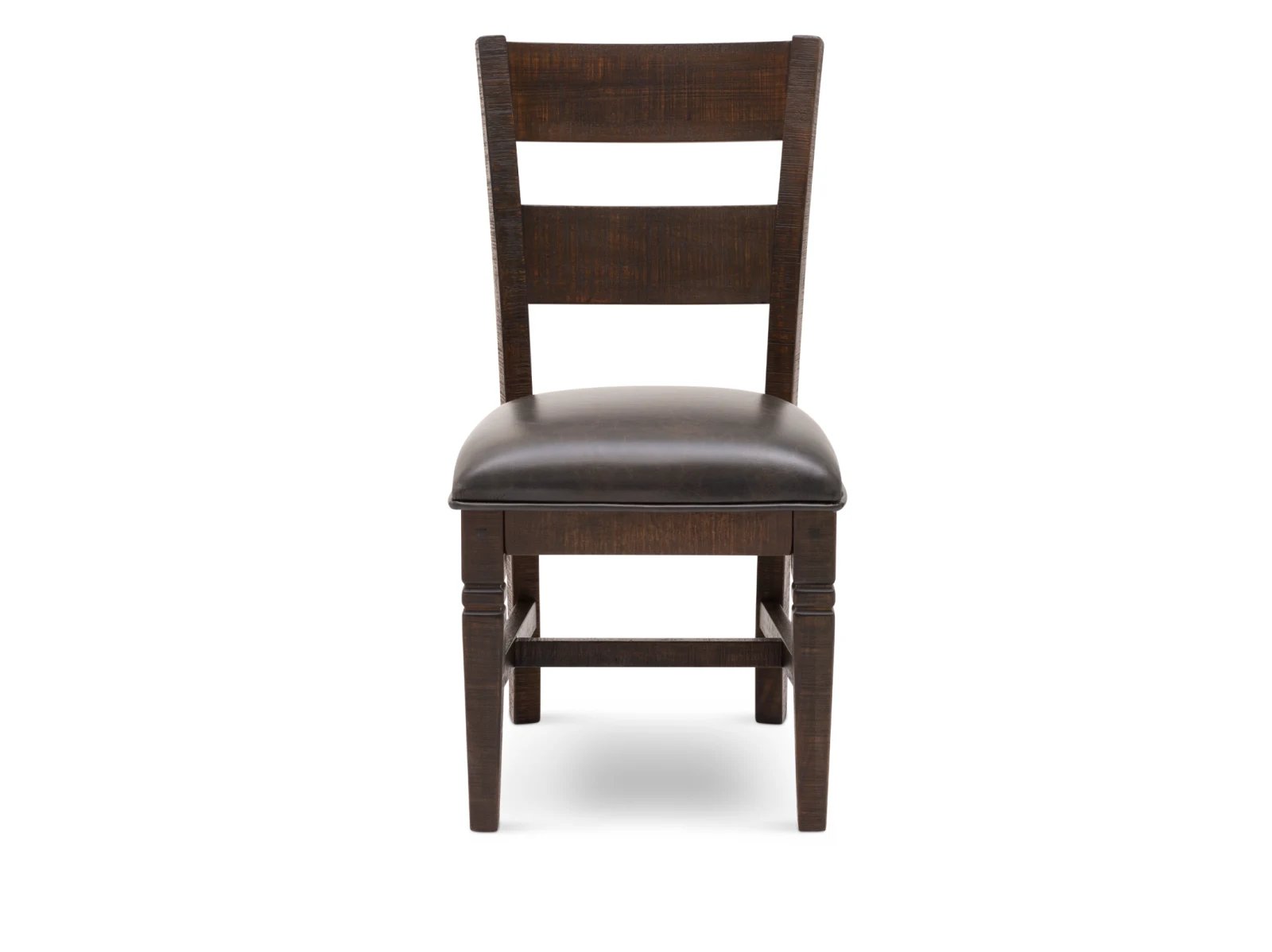 Bring farmhouse charm to your dining table with the Winter Park Dining Chair. This distinct dining chair is crafted from mahogany solids and veneers for a durable wooden profile. Its classic curved ladder back features two large slats, and is accentuated with hand-sawn distressing for that quintessential rustic look. Clean black vinyl adorns the seat, making it both stylish and easy to clean for years of loving use. Showcasing a brown tobacco leaf finish, the Winter Park is complete with tapered legs with reserved carved detailing. Add a dramatic allure that makes family meals and gatherings a lavish experience with the Winter Park Dining Chair.