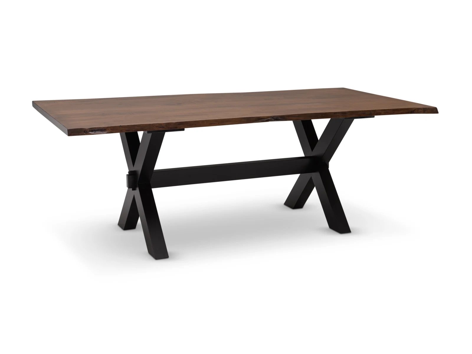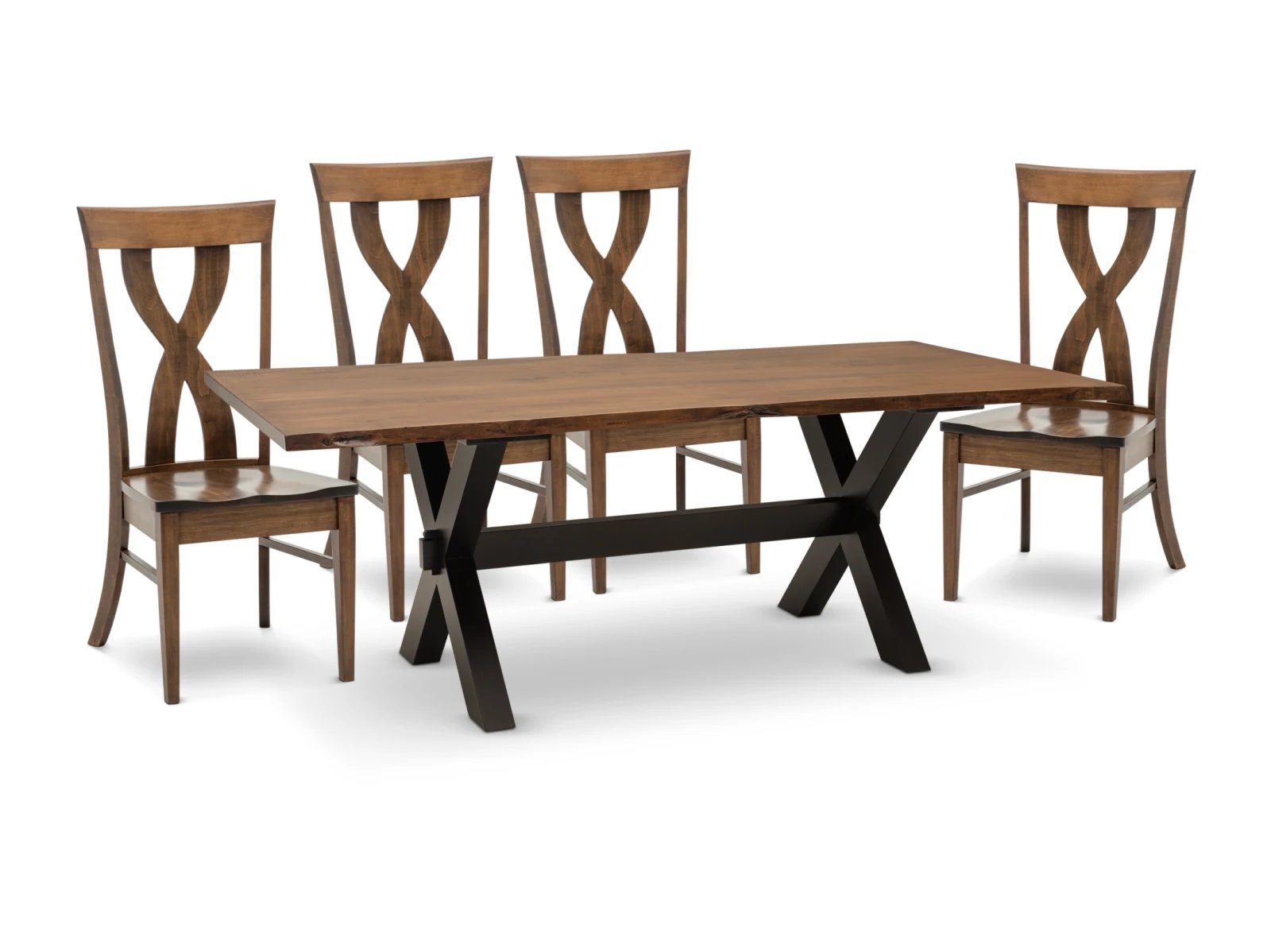 Featuring long-lasting solid brown maple construction, the Xander Amish 5 Pc. Dining Room Set brings the time-honored Amish look into the modern age in unforgettable style. This inviting set showcases a rich, chocolatey brown finish and is designed around the Xander Dining Table which features a gorgeous live edge table top, and it rests atop a traditional sawbuck trestle base with thick-cut square post legs in a dark black finish. The Xander Side Chairs offer an expertly crafted look emphasized by their contoured wooden seats, tapered front legs, and curved back legs; and they boast sinuous, X-shaped backrests which perfect the set’s updated look while also offering enhanced lumbar support.