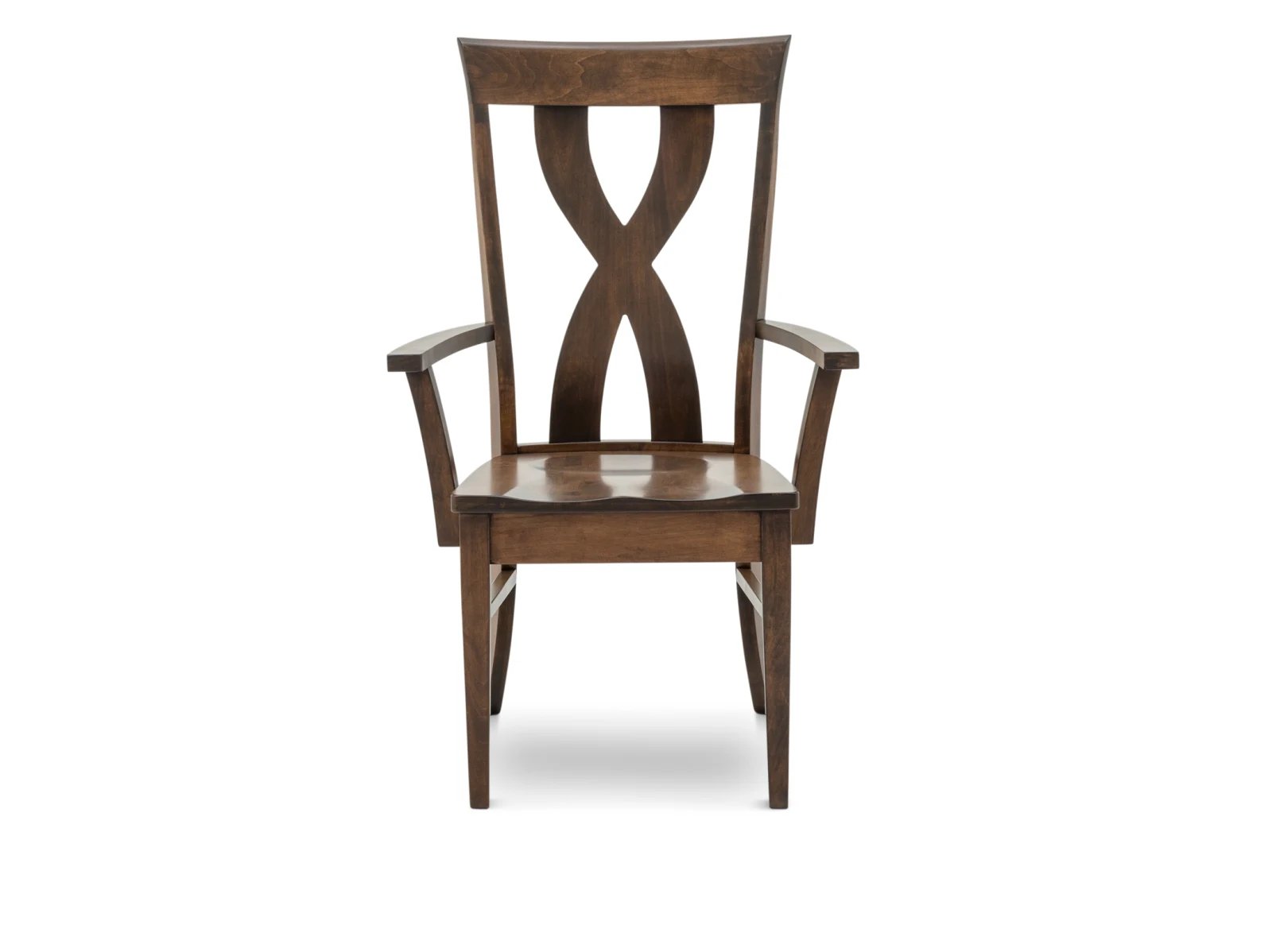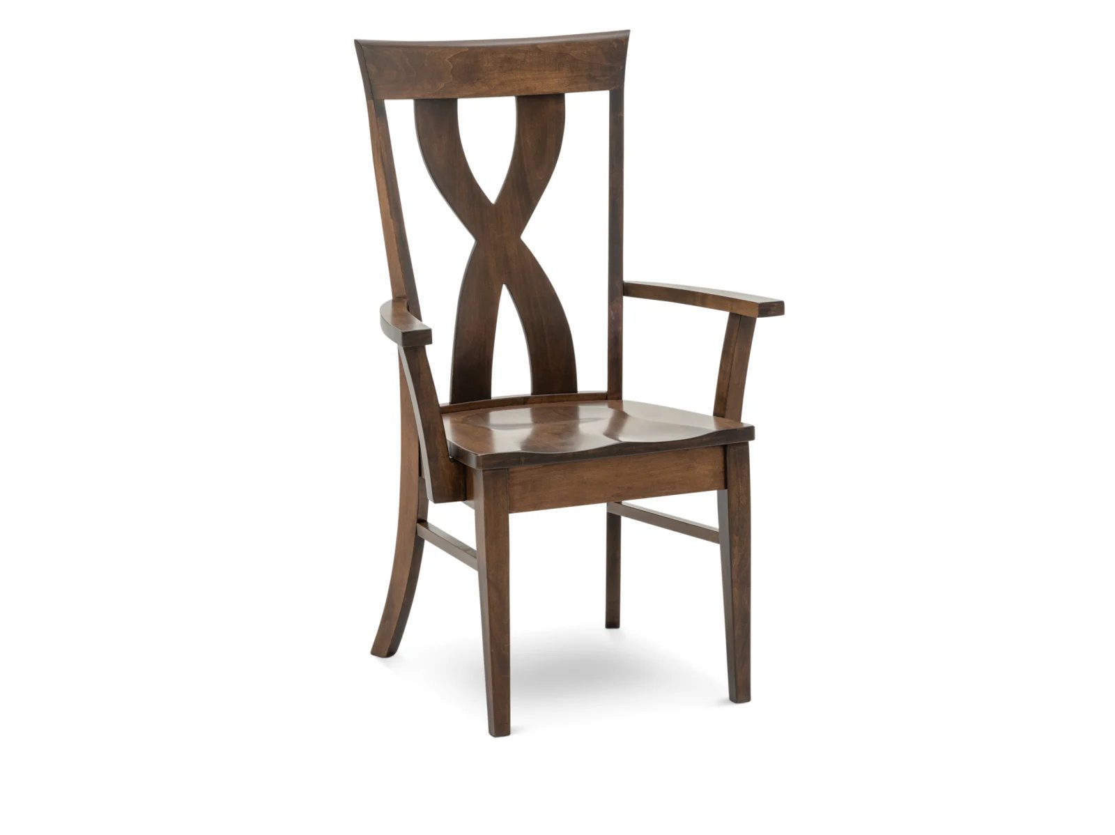 With long-lasting solid wood craftsmanship and a sophisticated silhouette, the Xander Amish Arm Chair is sure to become a treasured part of your dining room. Crafted from solid maple wood in a chocolatey brown finish, this eye-catching arm chair features a contoured wooden seat with a combination of tapered front legs and flared back legs, and it features a sinuous, X-shaped backrest which serves the dual purpose of instilling a touch of finely-crafted contemporary appeal while also providing enhanced lumbar support.
