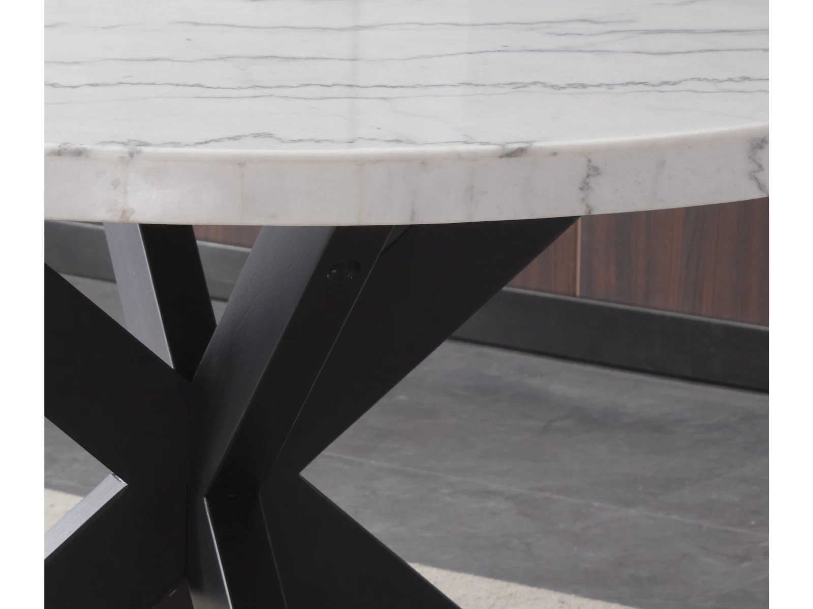 Round and flowing, the Xenia 52″ Round Marble Table is an elegant setting for an evening dinner or morning coffee. A beautiful round white marble top rests gracefully atop a black cross-timber pedestal base for a mix of rustic and contemporary designs. This 52″ modern round table easily seats six for a delightful and distinctive addition to kitchens, breakfast nooks, and dining rooms.