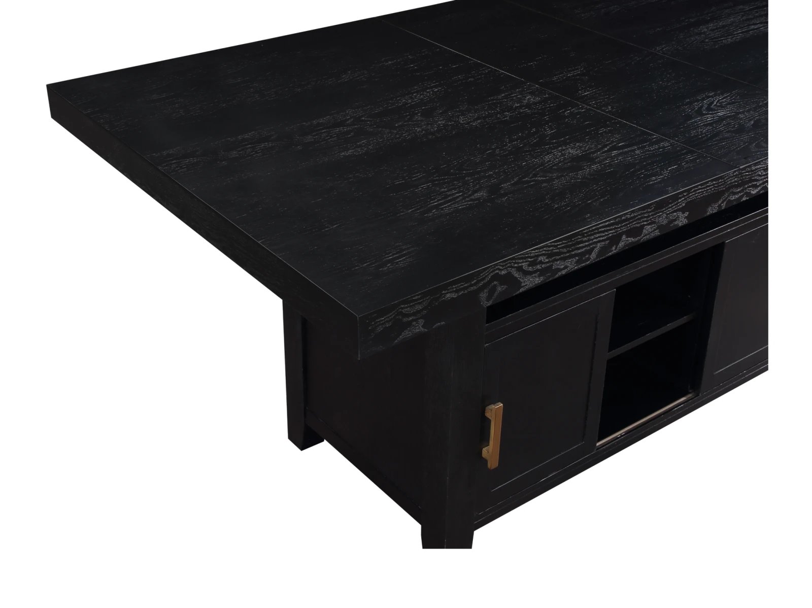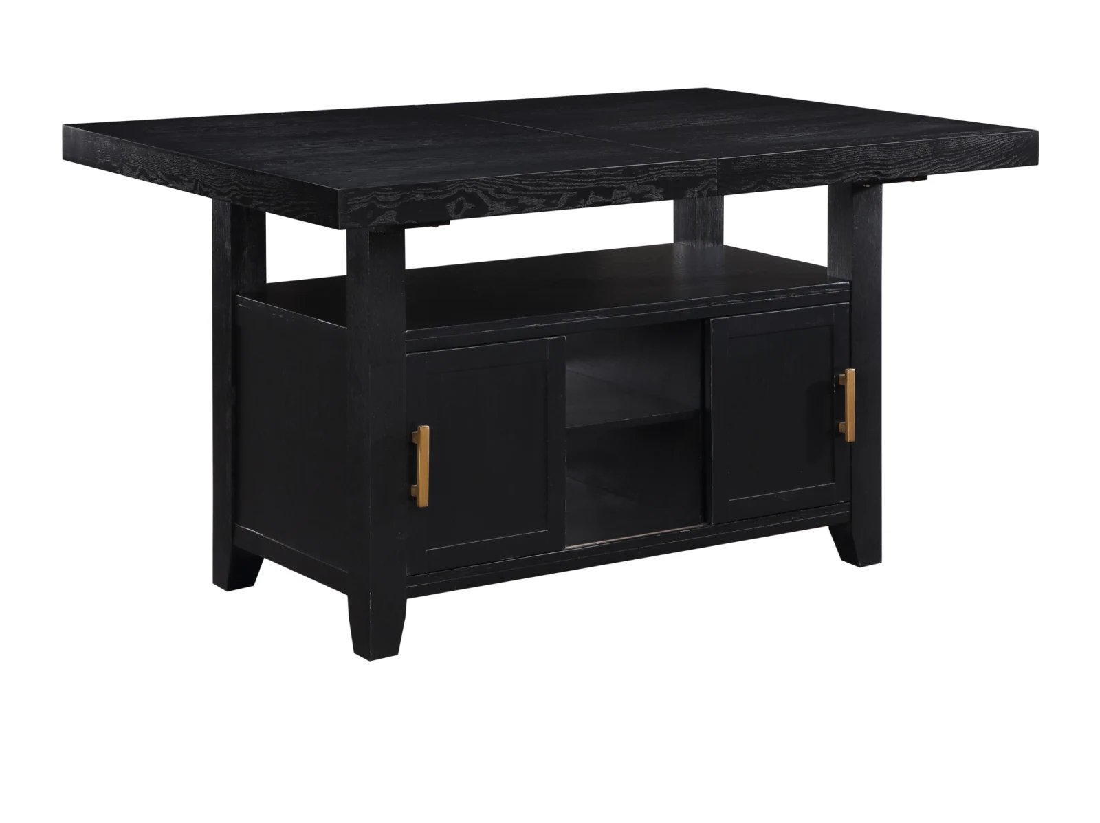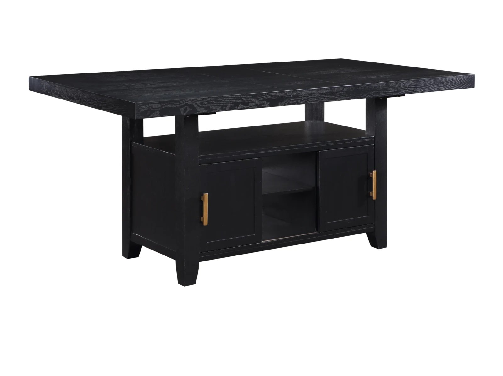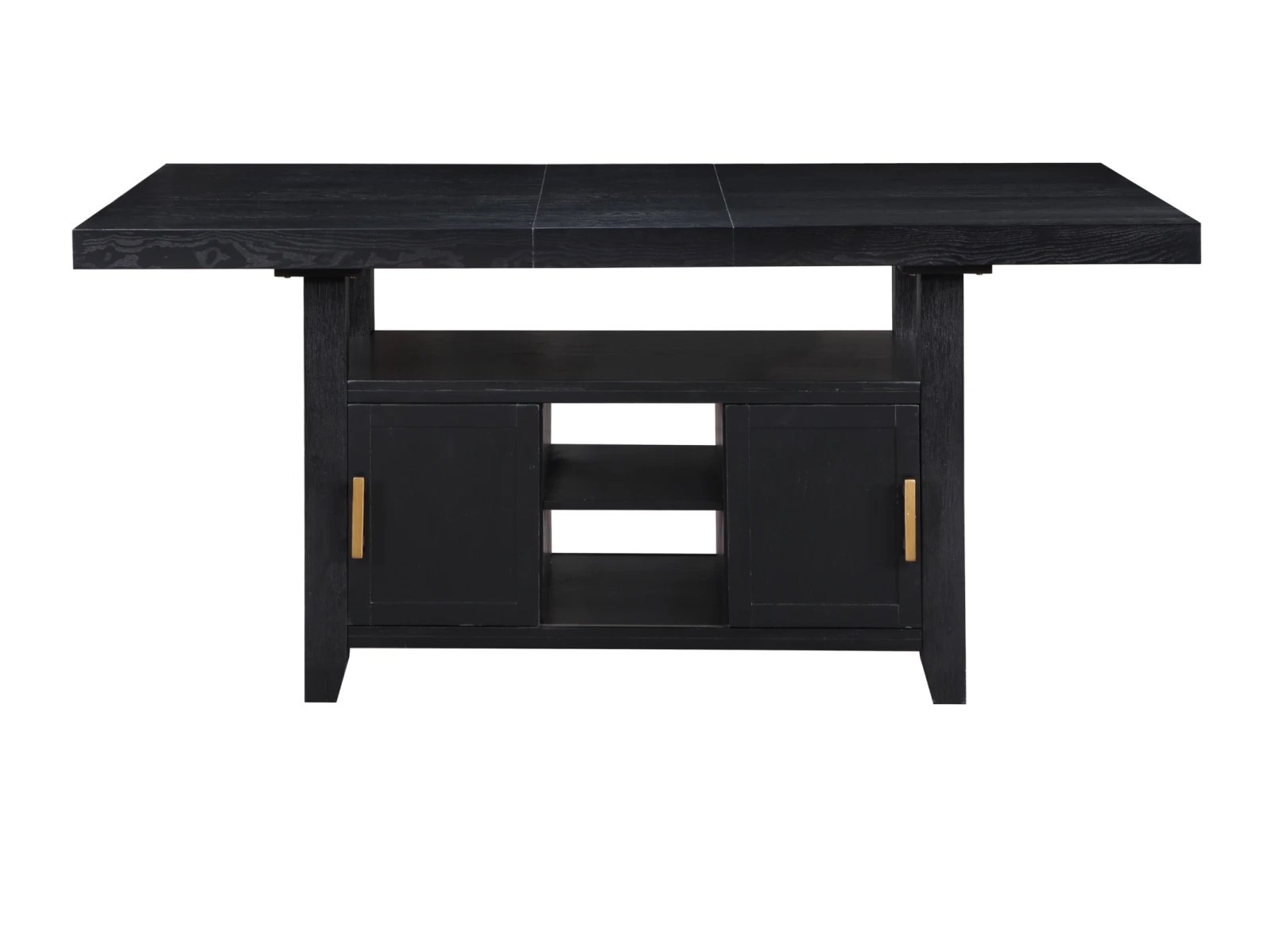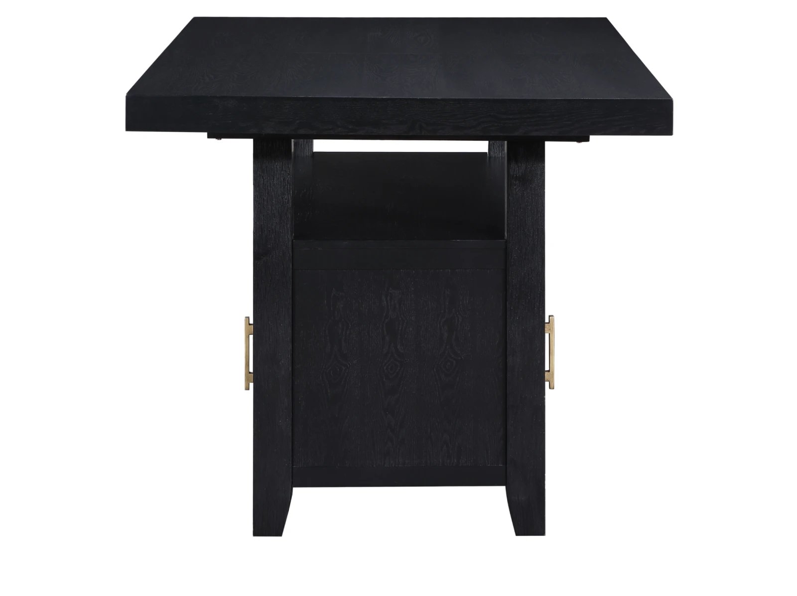 Maximize your dining space with the Ymir Counter Height Storage Table. This architectural marvel is made of acacia veneers and hardwood solids, featuring a weighty floating top that extends to 78 inches with a 14-inch leaf. The built-in storage base adds functionality to its sleek design, perfect for modern homes seeking style and practicality. It all comes together in a rubbed charcoal finish, accented with gold hardware for the perfect touch of glamour to its versatile design. Dining won’t ever be the same with the Ymir Counter Height Storage Table.