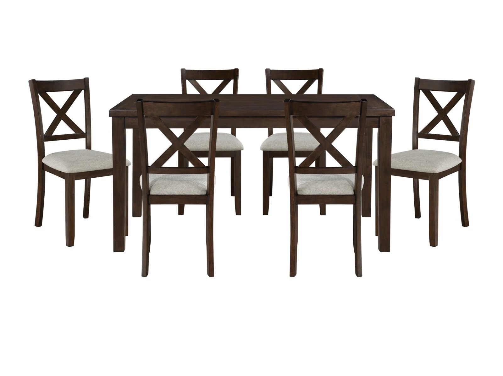 & Free ShippingStyled to maximize decorative versatility, the 7-piece Yorba Collection is a transitional option for your casual dining room. A dark cherry finish complements the acacia veneer that fronts the dining group, providing a neutral complement to your home’s décor. The table seats six by way of the accompanying X-back chairs, each featuring a beige textured fabric upholstered padded seat.