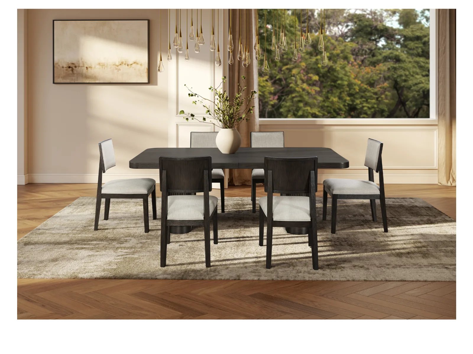 - Modern style dining table expands from 84″ to 102″ with one 18″ leaf to allow customization of table size